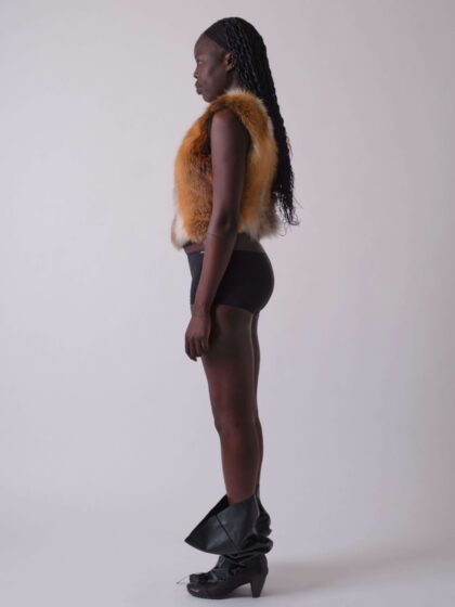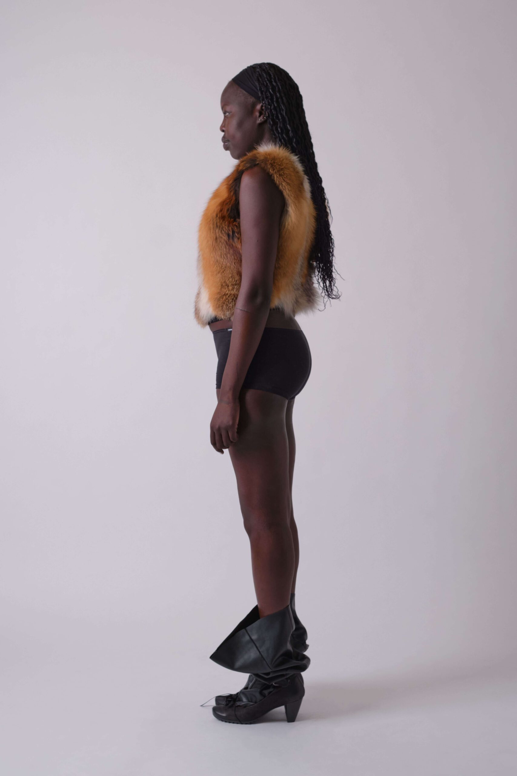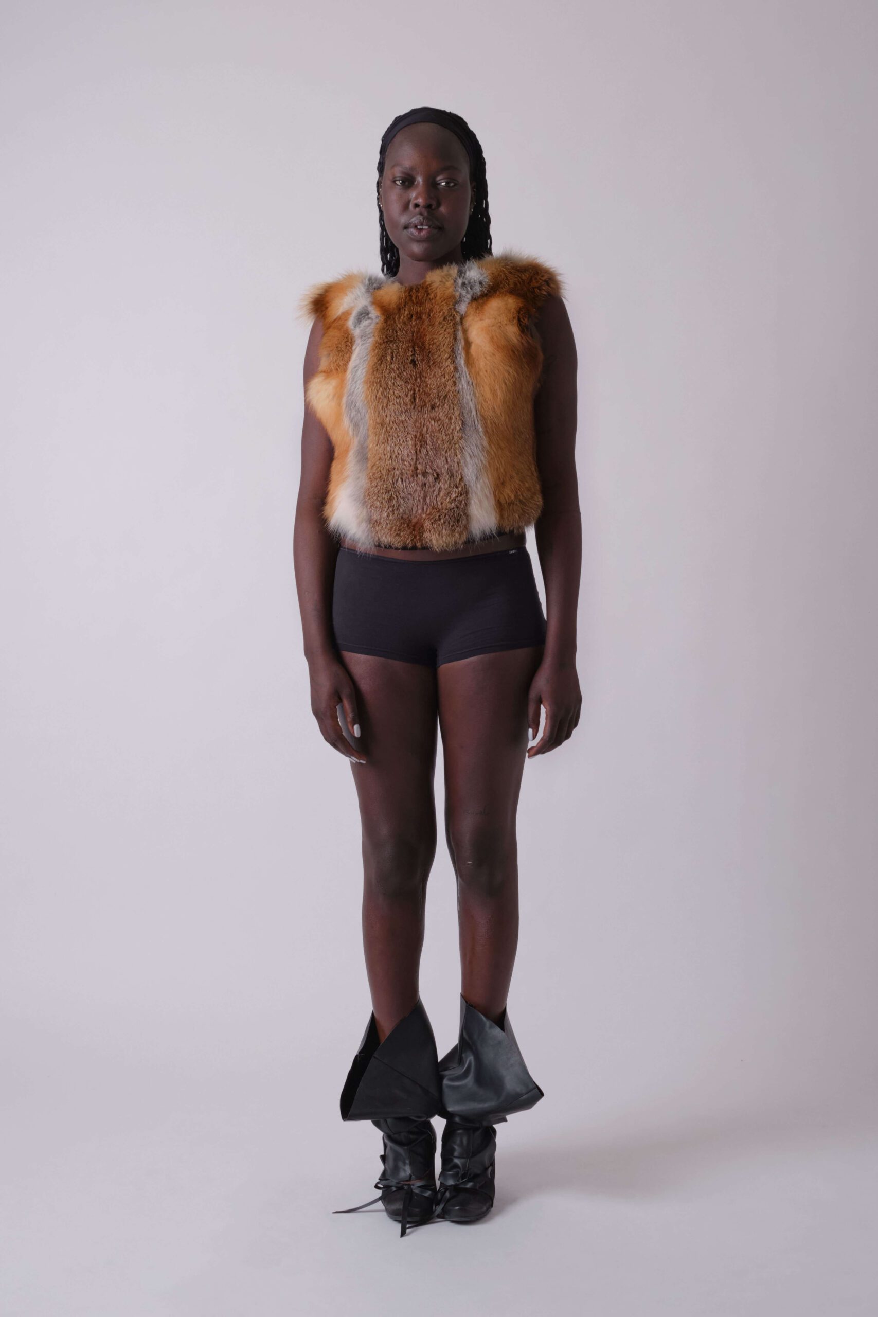 The “Vest” is crafted from responsibly sourced fox fur, harvested through strictly regulated Swiss hunts designed to support ecological balance and biodiversity. A statement piece with natural warmth and understated structure, it is lined with pure silk for comfort and elegance.